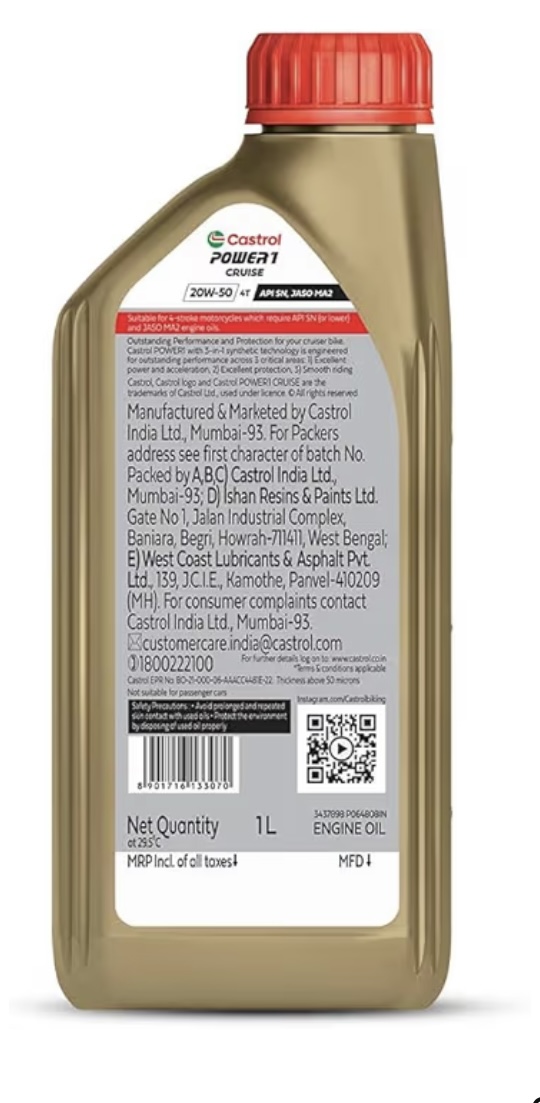 - 3-in-1 Synthetic Technology: Castrol POWER1 CRUISE 20W-50 Engine Oil utilizes advanced synthetic technology to deliver Excellent Power and Acceleration, Excellent Protection and Smooth Riding.