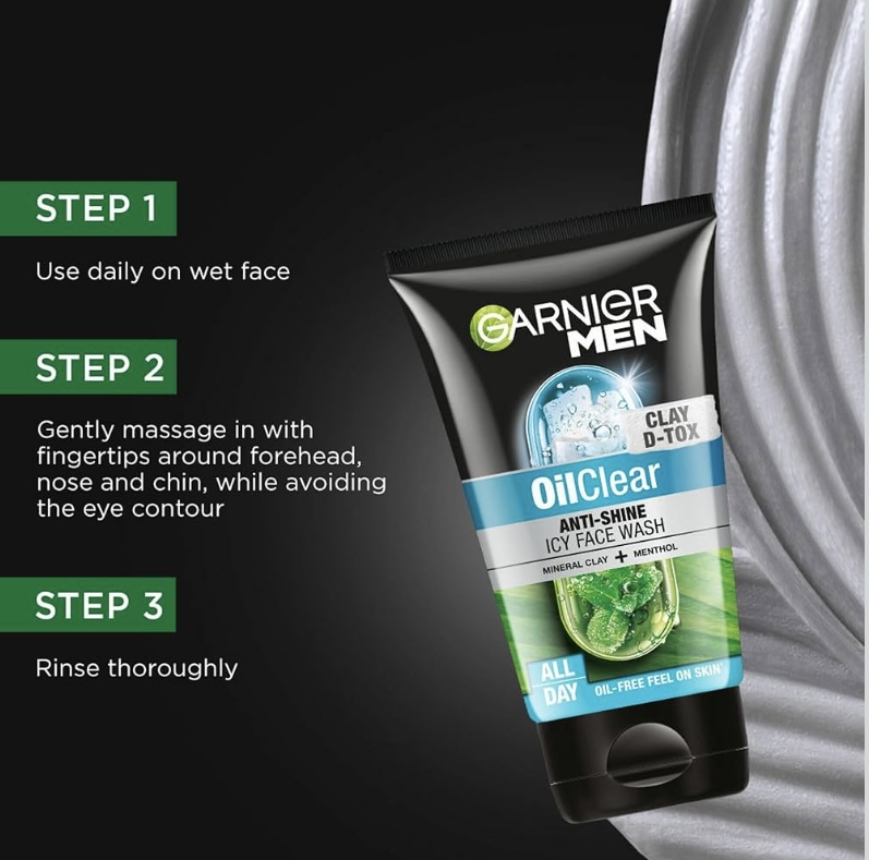 - We recommend using the Garnier Men Oil Clear Face wash twice daily, morning and night, as part of your skincare routine. It effectively removes dirt, oil, and impurities, keeping your skin clean, refreshed, and oil-free throughout the day and night.