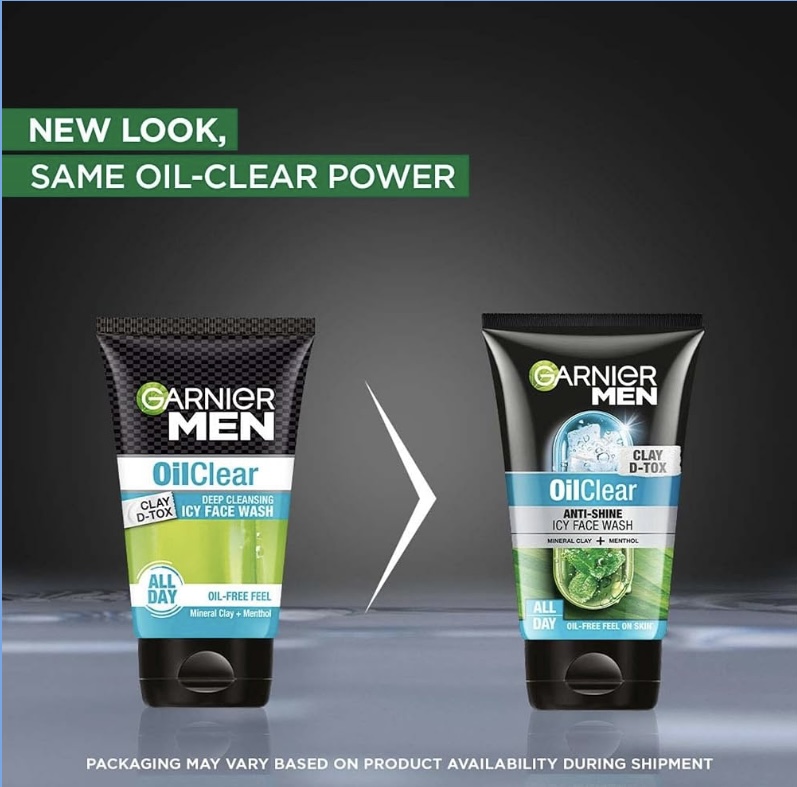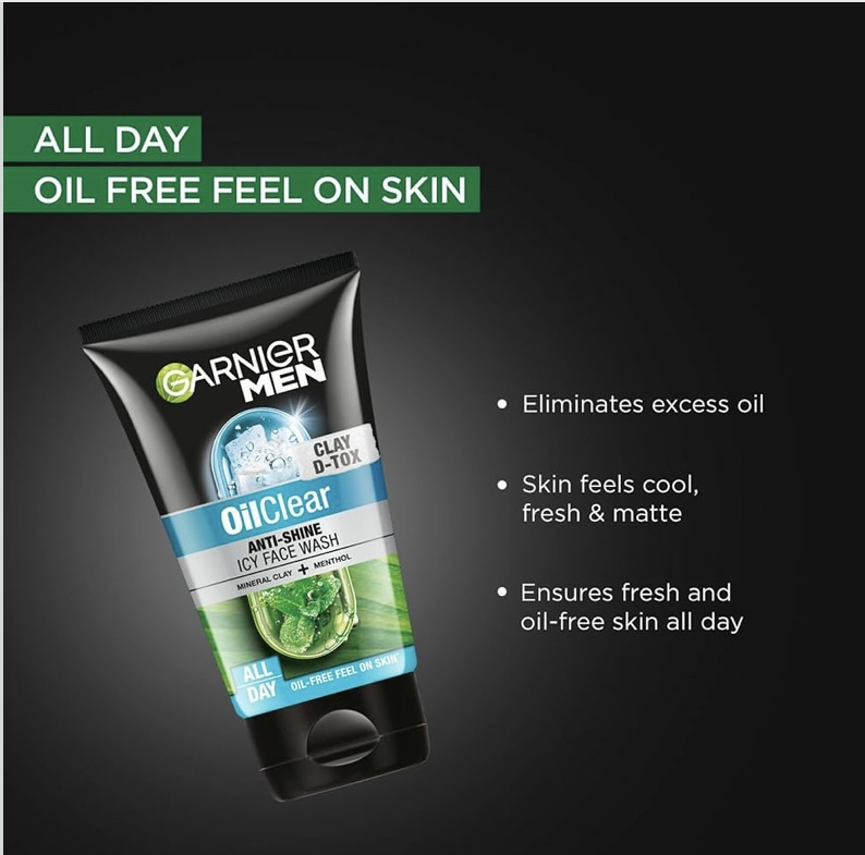 - Garnier Men Oil Clear Face wash features menthol and mineral clay. Menthol provides a cooling sensation, refreshing the skin, while mineral clay deeply cleanses pores, eliminating excess oil and impurities, and leaving the skin feeling clean, revitalised, and oil-free.